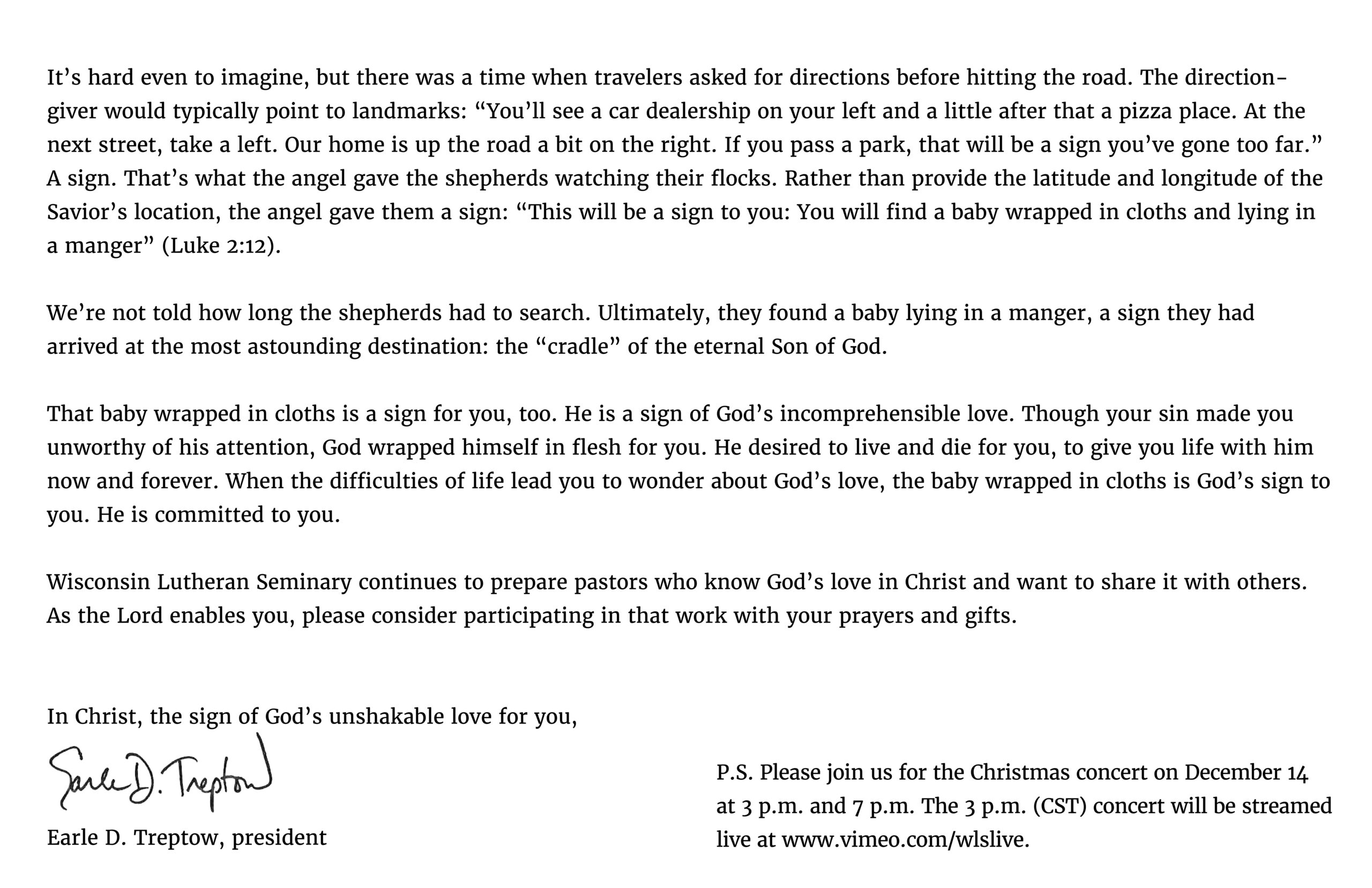 A Christmas card from President Treptow was mailed this month to friends and supporters of Wisconsin Lutheran Seminary. In his letter, he reminds us that the baby wrapped in cloths was not just a sign for those shepherds long ago but also a sign for us today. A sign of God’s love for us and commitment to us.